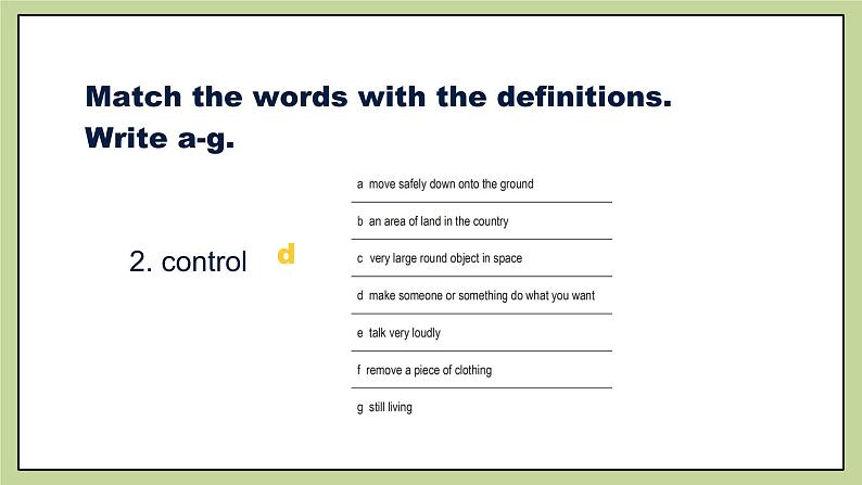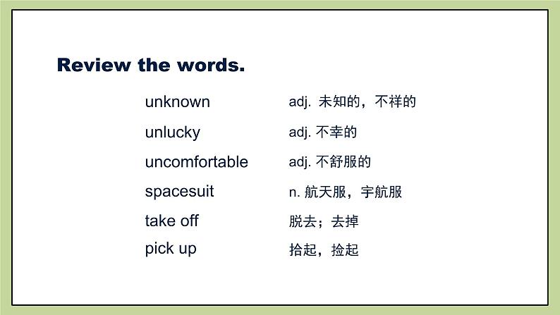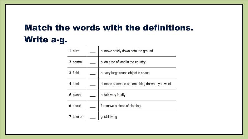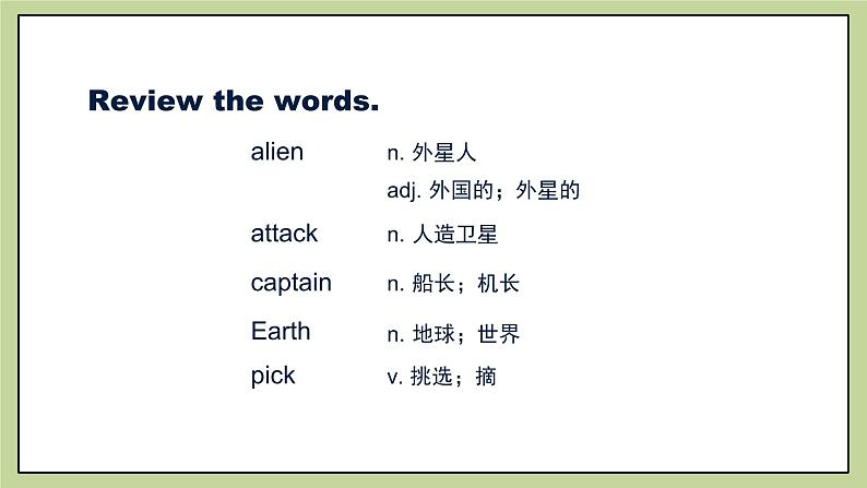 这是一份初中英语Lesson 12 The Spaceship完美版课件ppt,共43页。PPT课件主要包含了 1 alive, 3 field, 4 land, 5 planet, 6 shout, got ready, unusual, planet, pick up, top等内容,欢迎下载使用。