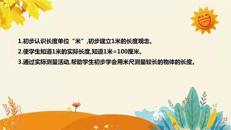 1.初步认识长度单位“米”,初步建立1米的长度观念。2.使学生知道1米的实际长度,知道1米=100厘米。3.通过实际测量活动,帮助学生初步学会用米尺测量较长的物体的长度。