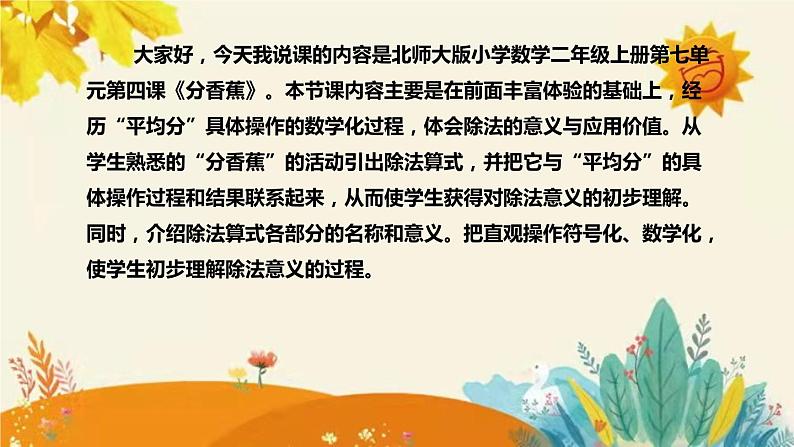 大家好,今天我说课的内容是北师大版小学数学二年级上册第七单元第四课《分香蕉》。本节课内容主要是在前面丰富体验的基础上,经历“平均分”具体操作的数学化过程,体会除法的意义与应用价值。从学生熟悉的“分香蕉”的活动引出除法算式,并把它与“平均分”的具体操作过程和结果联系起来,从而使学生获得对除法意义的初步理解。同时,介绍除法算式各部分的名称和意义。把直观操作符号化、数学化,使学生初步理解除法意义的过程。