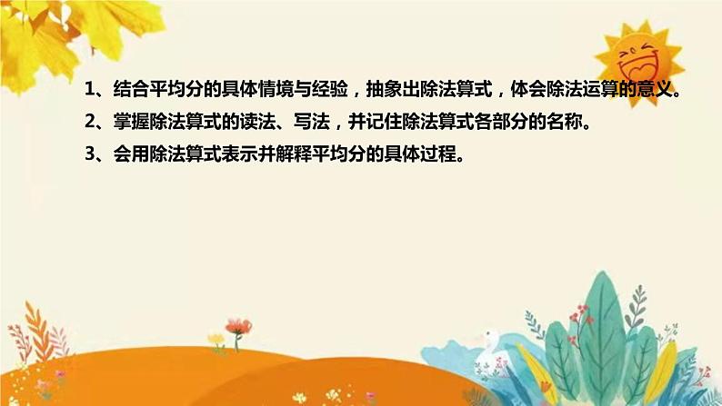 1、结合平均分的具体情境与经验,抽象出除法算式,体会除法运算的意义。 2、掌握除法算式的读法、写法,并记住除法算式各部分的名称。3、会用除法算式表示并解释平均分的具体过程。