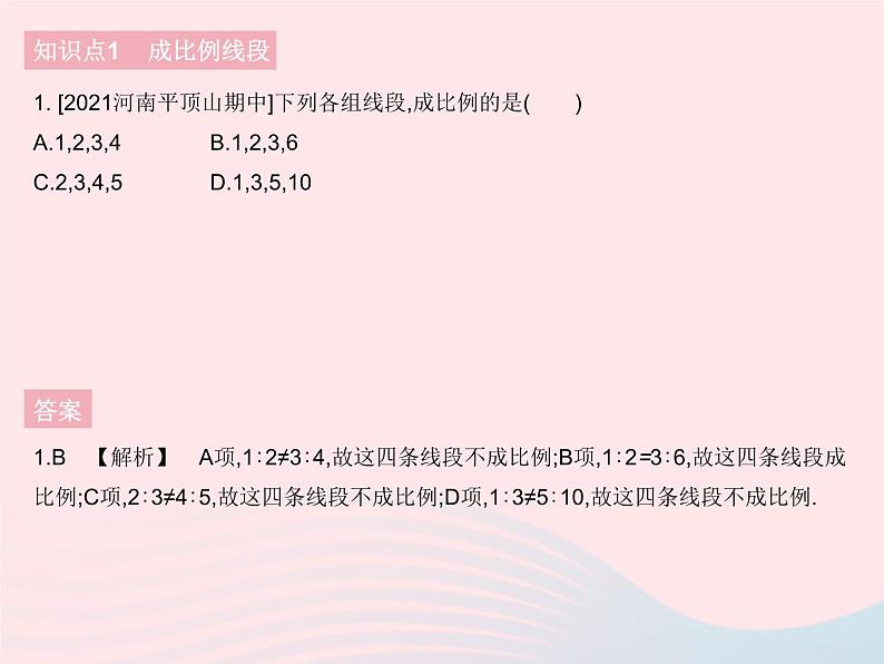1.B 【解析】 A项,1∶2≠3∶4,故这四条线段不成比例;B项,1∶2=3∶6,故这四条线段成比例;C项,2∶3≠4∶5,故这四条线段不成比例;D项,1∶3≠5∶10,故这四条线段不成比例.
