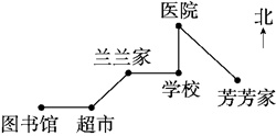 2.芳芳从家向西北走到医院,再向南走到学校,最后向西走到兰兰家。