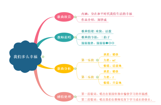 重点 | 学唱欢快地三拍子歌曲《我们多么幸福》,指导学生尽情地对美好生活进行歌唱,有感情的歌唱。 | |||||
