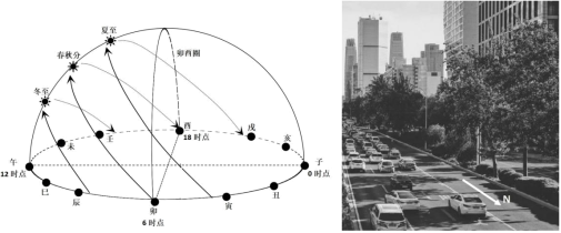 东点和正西点。图2为北京地区 “二分二至日太阳视运动示意(左)和某街道16时15分(地 方时)实景(右)图”。据此回答4~6题。