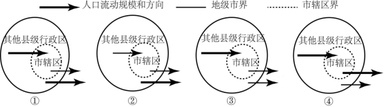 18. 图示意四种人口流动情况,与该市2010~2020年情况相符的是( )