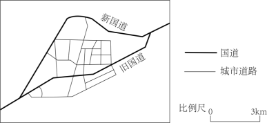 促进县城用地扩展 D. 吸引县城商业集聚22. 新国道通车前,旧国道面临的主要问题是( )①等级过低②线路过长③车流量过大④路口过多A.①② B.②③ C.③④ D.①④![]()
