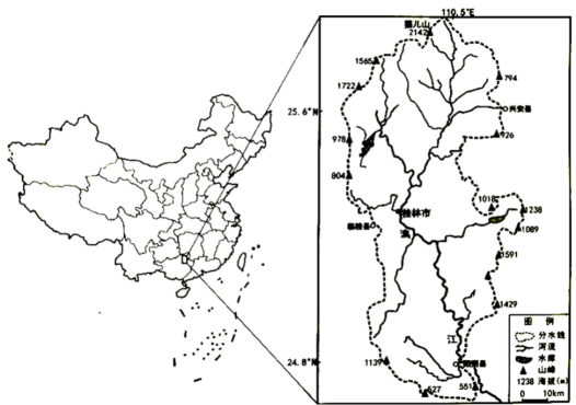 23. 推测新国道通车后( )A. 车辆过境速度提高 B. 车辆穿城用时增加C. 县城汽车保有量减少 D. 县城商业萎缩二、非选择题:共3题,共54分。24. 阅读材料,回答下列问题。材料一漓江位于广西壮族自治区东北部,属珠江流域西江水系。流域的北部为山地,森林茂密;中南部以盆地、平原为主。漓江丰水期径流量较大,洪水暴涨暴落;枯水期水量锐 减,河滩裸露。材料二下图为“漓江流域位置及水系分布示意图”。