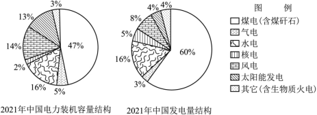 25. 阅读材料,完成下列问题。材料一 目前中国年碳排放约100亿吨,其中电力行业产生的碳排放超过总排放量的 40%,是碳排放的第一大户,推动电力系统转型升级是实现碳中和目标的关键路径。材料二 2021年中国电力装机容量和发电量结构图。