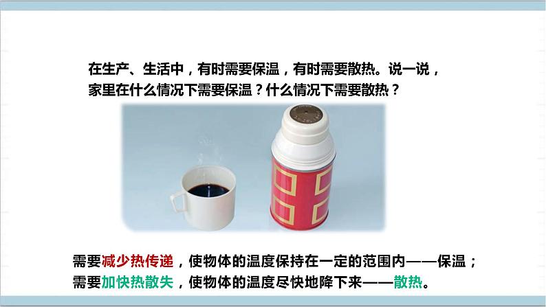 3. ______是指减少热传递,使物体的温度保持在一定的范围内;_______是指加快热散失,使物体的温度尽快地降下来。