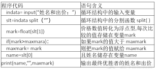 3、合作探究和同桌讨论一下,如果老师在这个程序里面输入“张朵朵 95”,姓名和价格的数据会被空格拆分,“张朵朵 ”被保存在哪里?“95”被保存在哪里?学生自主思考3分钟,指名学生回答问题。教师总结:“张朵朵 ”被保存在slt[0],“95”被保存在slt[1]。三、程序的实现1、编写程序任务:依据自己完善的算法流程,完成程序的编写工作。仔细阅读表中的程序,用简练的语言解释每一条语句的含义。学生完善流程,并写出语句含义,教师巡视。指名学生回答语句含义。教师总结: