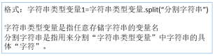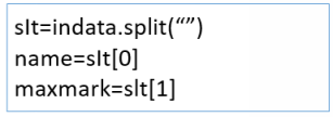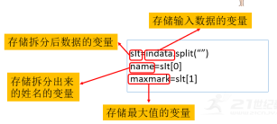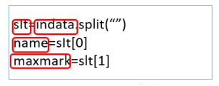 教师总结:该语句被执行时,“shu”变量中存储的字符串,只要遇到“5”,就会被分隔,该字符串中的数据会被分割为“12”,“4”,“678”,“6”等新的字符串。分割出来的子串被依次保存在以x变量名开头的若干个位置中,如“12”被保存在x[0]中,“4”被保存在x[1]中,按照顺序依次往后排。其中每一个都可以看作单独的字符串类型变量。2、数据拆分教师讲解:如果,我们输入时用空格来分割“姓名”和“价格”,那么,使用分割函数拆分后,第1个数据为姓名,而第2个数据则为出价。输入数据的存储变量定义为 “indata”,存储拆分后数据的变量名字定义为“slt”,拆分出来的姓名最后存储在变量“name”中,存储最大值的变量定义为“ maxmark”。变量定义可依据个人习惯,直观简洁为好数据拆分语句: