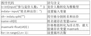 指名学生回答问题。教师:没错,不确定。教师:像上节课那样设置确定的a、b、c三个变量的程序显然是不能满足实际需要的另外,我们能不能完善程序,使程序能输入和输出优胜者的姓名和出价呢?说说你的想法。学生思考并组内交流,进入今天的新课题。邀请学生回答问题。教师:这节课我们就来学习可以找出多个数据中最大值的擂台算法,以及同时输出优胜者姓名和出价的方法。 通过案例和教师提问,学生自主思考问题。 引入案例有助于提高学生兴趣,帮助学生理解学习任务,引导学生思考。 讲授新课一、算法描述及流程图1、构建循环结构教师提问:随着问题复杂度的增加,我们需要将问题进行拆解细化。细化的原则是将问题拆解为不可再分的小问题然后分别实现。你会如何构建循环结构呢?学生思考并组内交流。指名学生回答问题。教师总结:(1)确定循环次数。(2)确定循环体有哪些操作。2、画流程图教师:我们已经掌握了三个数据比较大小的表达式构建和选择结构的写法。现在要扩展到多人,其算法跟三人竞价相似,多人竞价的关键,就是重复的比较过程。与打擂台很相似,留在台上的是胜者。我们可以根据输入的人数,构建循环结构,从而找到最髙的价格。假设我们先不实现输入输出优胜者的“姓名、价格”的功能,只描述一个多人竞价找出最高出价的算法,请同学们画出流程图。(提示:构建循环结构,人数可设置为n)学生自主思考并画流程图。教师巡视。教师总结: