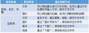 ○注:①合法获取素材,并将获取到的素材及时记录到“资料搜索表”中,写明素材来源;②将获取到的素材保存在个人作品文件夹中“资料”→“文字”或“图片”或“音乐”或“视频”文件夹里。