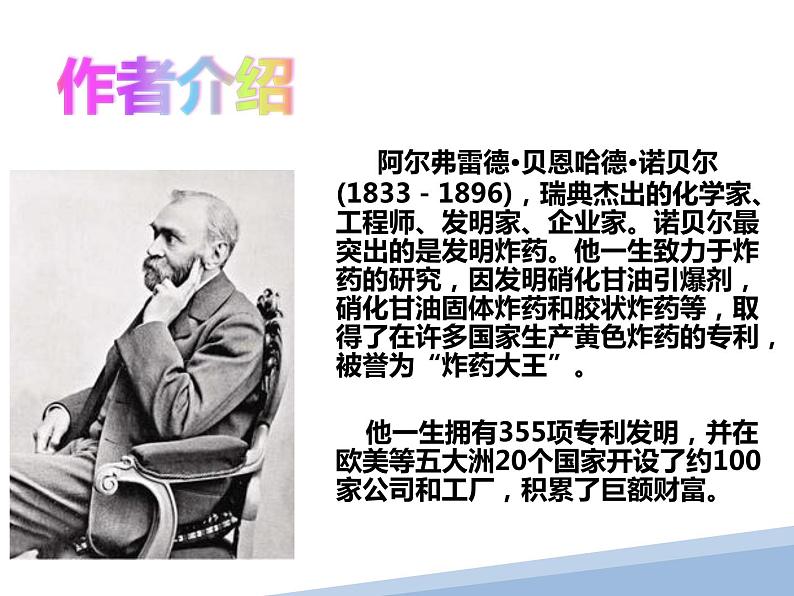 阿尔弗雷德·贝恩哈德·诺贝尔 (1833-1896),瑞典杰出的化学家、工程师、发明家、企业家。诺贝尔最突出的是发明炸药。他一生致力于炸药的研究,因发明硝化甘油引爆剂,硝化甘油固体炸药和胶状炸药等,取得了在许多国家生产黄色炸药的专利,被誉为“炸药大王”。