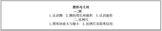 【教学内容】教材第98~104页,图形与几何共包含3个单元,第1单元—圆和扇形,第4单元—圆的周长和面积,第6单元—比例尺。【教学目标】1.认识圆和扇形,会画圆。2.掌握圆的周长和面积公式,会求圆的周长和面积。3.能利用方格纸按一定的比例尺将简单图形放大或缩小。4.了解比例尺,在具体情境中按给定的比例尺进行图上距离与实际距离的计算。【教学准备】PPT课件、圆规、直尺、铅笔。