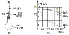 (1)如图甲所示装置的气密性良好,在三只250 mL的烧瓶内收集满二氧化碳气体,在三个注射器内各装入85 mL液体(分别是水、饱和石灰水、40%的氢氧化钠溶液),连接好装置和压强传感器。