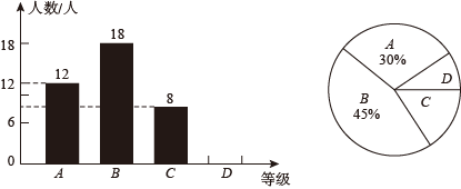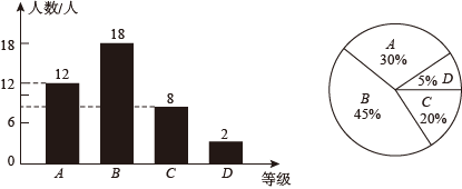 4.(1)解:∵从中随机抽取部分居民进行垃圾分类知识测试,∴本次的调查方式是抽样调查,∵A等次的人数由12人,A等次占扇形的30%,∴12÷30%=40,∴样本容量是多少40;(2)∵B等次占扇形的45%,∴40×45%=18,∴B等次的人数18人,∴40-12-18-8=2,∴D等次的人数2人,∵8÷40=0.2=20%,2÷40=0.05=5%,∴C、D等次占扇形的20%,5%,如下图,