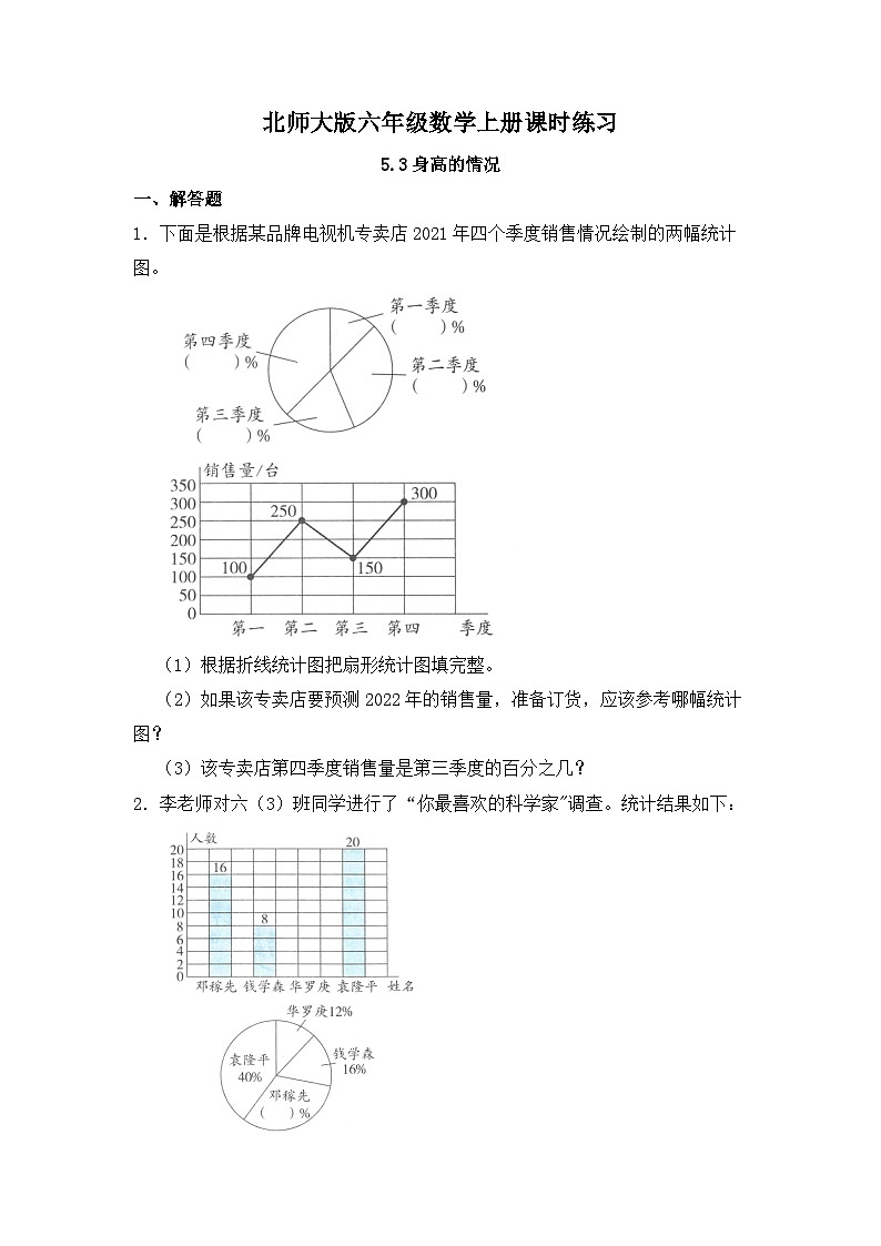 北师大版六年级数学上册课时练习5.3身高的情况一、解答题1.下面是根据某品牌电视机专卖店2021年四个季度销售情况绘制的两幅统计图。