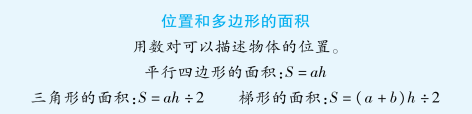 【学情预设】翻阅教材回顾所学内容,可以说出主要有五部分内容,分别是“位置”“平行四边形面积”“三角形面积”“梯形面积”和“组合图形的面积”。(板书课题:位置和多边形的面积)