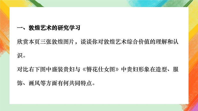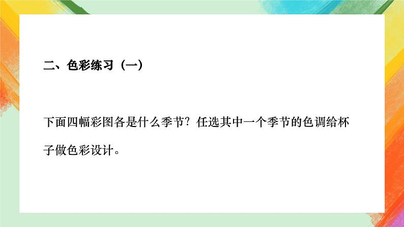 综合练习 | 一、敦煌艺术的研究学习 欣赏本页三张敦煌图片,谈谈你对敦煌艺术综合价值的理解和认识。 对比右下图中盛装贵妇与《簪花仕女图》中贵妇形象在造型、服饰、画风等方面有何共同特点。 二、色彩练习(一) 下面四幅彩图各是什么季节?任选其中一个季节的色调给杯子做色彩设计。 三、色彩练习(二) 在下列图片中找寻并说出色彩三要素。 四、评述 下图中的面具你最喜欢哪一件?给大家分析一下它的制作方法和特点。说说你还知道哪些民族或民间面具。 |