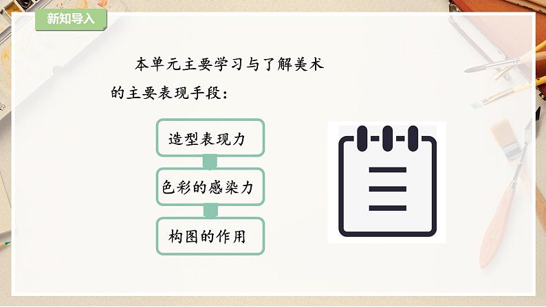 本单元主要学习与了解美术的主要表现手段: 造型表现力 色彩的感染力 构图的作用
