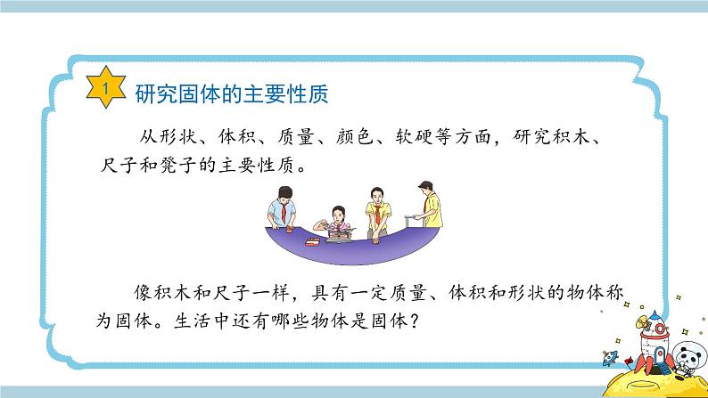 9.固体、液体和气体【教材简析】本课是本单元的起始课。教材按照物体的不同状态设计了三个活动。活动1“研究固体的主要性能”目的是让学生通过实验探究固体的性质,建构固体的概念。活动2“研究液体的主要性质”意在引领学生通过实验认识液体的性质,进而建构液体的概念。活动3“研究空气的主要性质”在学生已有知识的基础上,进一步引导学生建构气体的概念。应用与拓展“比较固体、液体和气体的性质”引导学会对物质的三种形态进行比较 ,从而对物质三种形态产生更加理性的认识。【学情分析】在生活中,由于学生已经接触了多种多样的物体,积累了一些与物质状态有关的感性知识,对固体、液体和气体这些词汇也有了一定的了解。同时,学生在一年级下册教材的学习中已经认识了水是没有颜色的。没有气味、没有固定形状的液体;空气是一种没有颜色、没有气味、没有固定形状的气体;在本册第一单元已经学会使用简单的测量工具来测量物体,这些都为学生研究固体、液体和气体的性质奠定了基础。【教学目标】科学概念目标1.能说出固体有确定的形状、体积和质量;液体有确定的体积和质量,液体表面在静止时一般会保持水平。2.能说出空气没有确定的形状和体积,但有质量并占有一定的空间,空气总会充满各处。科学探究目标1.能在已有知识的基础上,提出可以探究的问题。2.能对空气是否有质量进行假设。3.能设计空气是否有质量的实验方案。4.能按照实验方法进行实验,并记录实验现象。5.能对实验现象进行分析,综合得出实验结论。科学态度目标 愿意与同学合作完成对多种物体共同性质的探究。科学、技术、社会与环境目标能分别举例说出固体、液体和气体在人类生产生活中的用途。【教学重难点】重点:固体和液体的主要性质。 难点:固体、液体与气体之间的性质比较。【教学准备】教师准备:积木、尺子、电子秤、水、牛奶、酱油、量简、透明玻璃杯、水盆、气球、篮球、与本课有关的图片和视频等。学会准备:《科学学生活动手册》、笔。【教学过程】第一课时一、创设情境,提出问题1.引导:我们身边的物体多种多样,它们形态各异,但彼此又有很多共同之处。看,这些物体你都认识吗?2.教师出示课件,组织学生观看,也可以组织学生观看教材上的图片。3.提问:这些物体有哪些共同性质呢?二、探究发现,形成知识1.研究固体的性质。(1)提出问题:同学们,积木、尺子和凳子有什么性质呢?让我们用观察的方法来研究它们吧!(2)掌握方法:教师讲解观察的方法。①用眼睛看一看它们是什么形状和颜色的。②用手压一压,观察它们的软硬。③用尺子或其他方法量一量,并计算出它们的体积。④用电子秤或托盘天平称一称它们的质量。(3)观察记录:学生观察,并将观察到的结果记录在《科学学生活动手册》第11页中。教师巡回指导,适当给予帮助。(4)分析比较:组织学生汇报观察结果。比较积木、尺子和凳子的相同点。(5)归纳总结:像积木和尺子一样,具有一定质量、体积和形状的物体被称为固体。2.研究液体的主要性质。(1)提出问题:同学们,现在我们知道了固体的主要性质。那么,牛奶、水和酱油又有什么性质呢?(2)掌握方法:教师讲解观察的方法。①将液体倒入量简中,观察它的体积。②用手将水槽中的水搅一搅,观察有什么现象。③用电子秤称有称液体的质量是多少克。④将水倒进不同形状的杯子里,观察是什么形状的。⑤将水倒入玻璃碗中,静止后观察水面,将碗底的一边垫上一块橡皮,静止后再观察水面,发现了什么?(3)观察记录:学生观察,教师巡回指导,提示学生将观察结果记录在《科学学生活动手册》第11页中。(4)分析比较:组织学生分析观察结果,比较有什么相同点。(5)归纳结论:像水和牛奶一样,有一定的质量和体积,没有确定的形状,具有流动性的物体称为液体。液体在静止的时候液面保持水平。三、实践应用、拓展延伸举例说出生活中的固体和液体。第二课时一、创设情境,提出问题1.引导: 上节课,通过学习我们知道了固体和液体的主要性质,那么气体有哪些性质呢?2.提问:我们已经知道空气是一种无色无味的气体,空气还有哪些性质?3.记录:引导学生把想知道的问题列举出来,并记录在“我的问题卡”上。二、探究发现,形成知识1.探究空气是否占据空间。(1)掌握实验方法。教师播放课件,学生观看并识记。实验方法:①将纸团紧紧地塞到杯子的底部,压实。②将杯子倒立竖直压入水中,水面要漫过杯底。③将杯子竖直提起,离开水面,用抹布将烧杯的内壁、外壁轻轻地擦干。④从杯子底部取出纸团,用手摸一摸,观察湿了没有。⑤将杯底塞有纸团的杯子,再次压入水中,然后将杯子倾斜,观察有什么现象。⑥将杯子竖直提起,离开水面,用抹布将杯子的内壁。外壁擦干。⑦从杯子底部取出纸团,用手摸一摸,观察湿了没有。(教师画出关键词,让学生利用关键词记忆。)注意事项:①小组同学分工合作(包括观察、记录、收拾等)。②实验过程中要安静有序。(2)实验观察。学生分组实验,将观察到的现象记录下来。(3)分析现象。讨论:第一次实验中纸团没有湿说明了什么?第二次实验中纸团湿了又说明了什么?教师组织学生讨论,然后汇报讨论结果。(4)得出结论。空气占据空间,将得出的结论记录在《科学学生活动手册》第11页中。2.探究