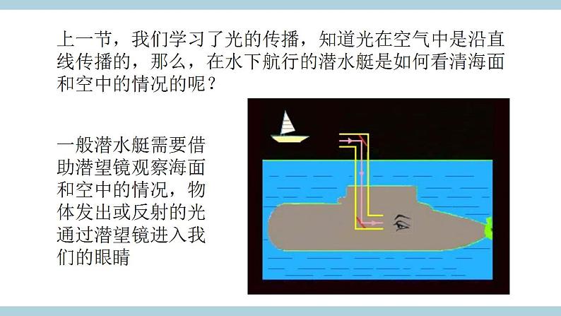 展开上一节,我们学习了光的传播,知道光在空气中是沿直线传播的,那么,在水下航行的潜水艇是如何看清海面和空中的情况的呢?