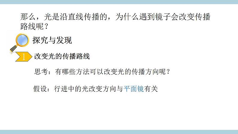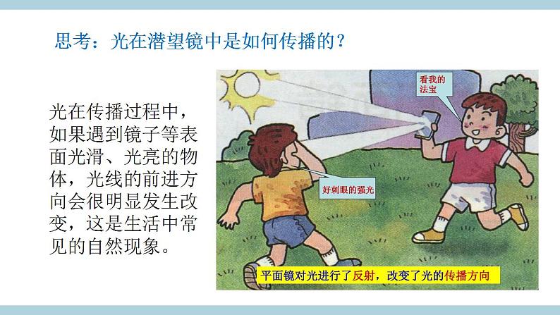 光在传播过程中,如果遇到镜子等表面光滑、光亮的物体,光线的前进方向会很明显发生改变,这是生活中常见的自然现象。