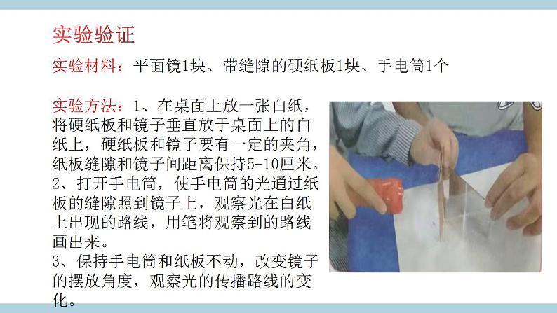实验材料:平面镜1块、带缝隙的硬纸板1块、手电筒1个