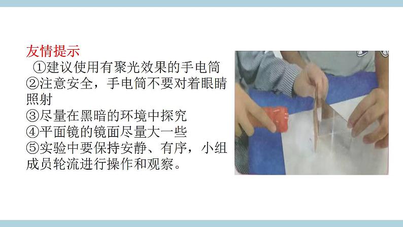 友情提示 ①建议使用有聚光效果的手电筒②注意安全,手电筒不要对着眼睛照射③尽量在黑暗的环境中探究④平面镜的镜面尽量大一些⑤实验中要保持安静、有序,小组成员轮流进行操作和观察。