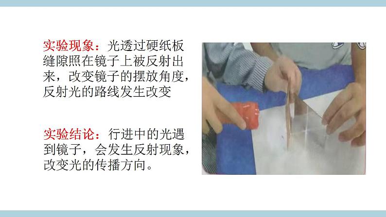 实验现象:光透过硬纸板缝隙照在镜子上被反射出来,改变镜子的摆放角度,反射光的路线发生改变