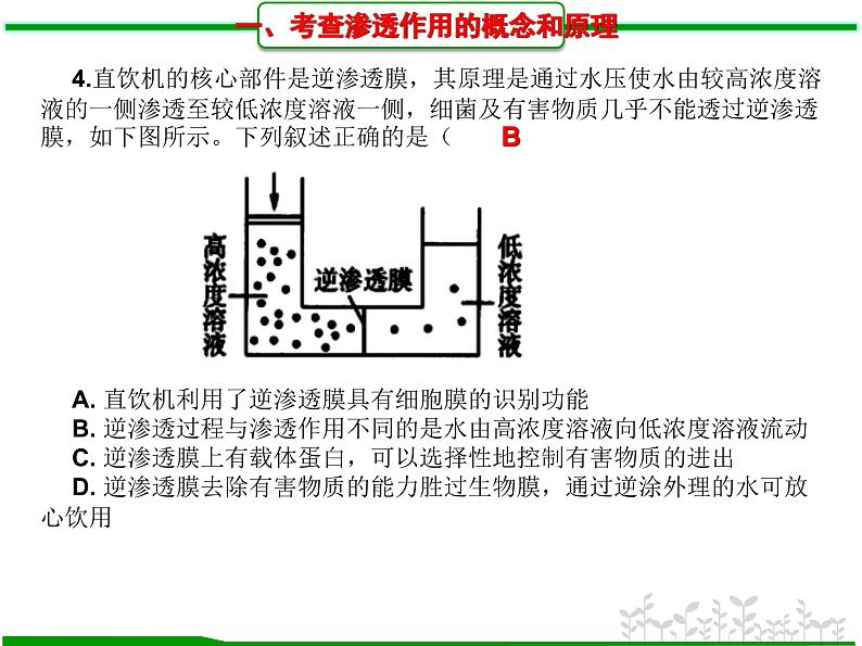 4.直饮机的核心部件是逆渗透膜,其原理是通过水压使水由较高浓度溶液的一侧渗透至较低浓度溶液一侧,细菌及有害物质几乎不能透过逆渗透膜,如下图所示。下列叙述正确的是( )A. 直饮机利用了逆渗透膜具有细胞膜的识别功能B. 逆渗透过程与渗透作用不同的是水由高浓度溶液向低浓度溶液流动C. 逆渗透膜上有载体蛋白,可以选择性地控制有害物质的进出D. 逆渗透膜去除有害物质的能力胜过生物膜,通过逆涂外理的水可放心饮用
