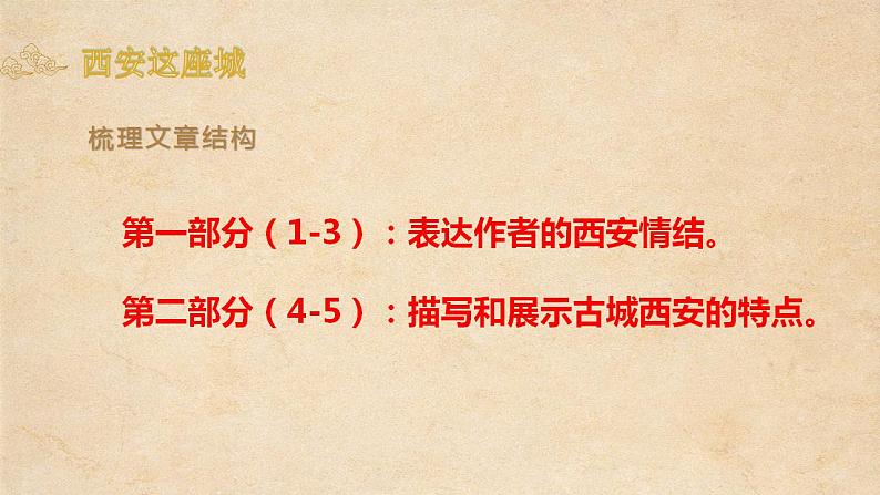 第一部分(1-3):表达作者的西安情结。第二部分(4-5):描写和展示古城西安的特点。