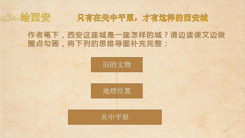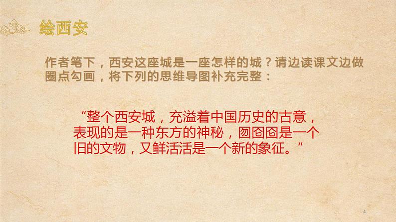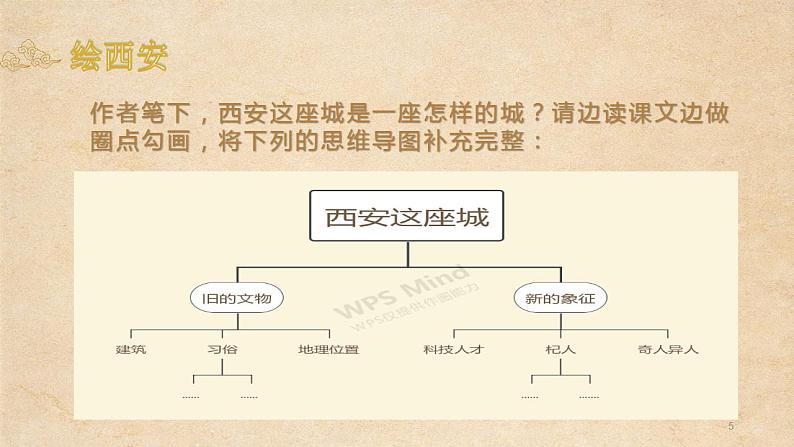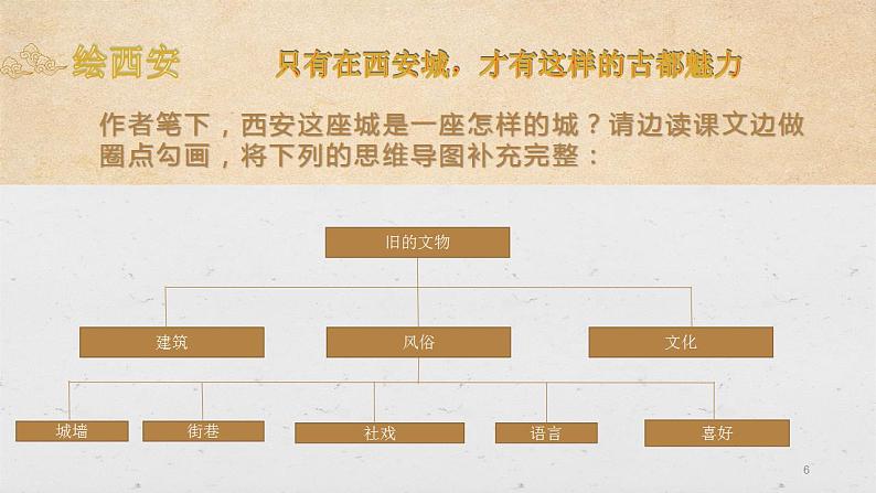 作者笔下,西安这座城是一座怎样的城?请边读课文边做圈点勾画,将下列的思维导图补充完整: