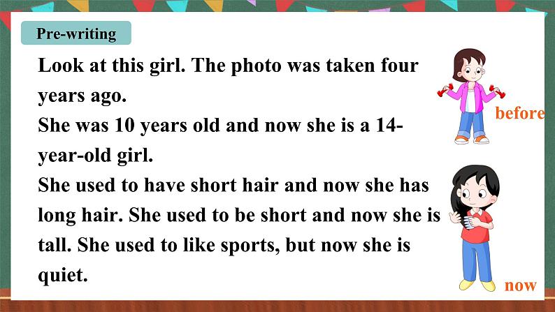 Lk at this girl. The pht was taken fur years ag.She was 10 years ld and nw she is a 14-year-ld girl. She used t have shrt hair and nw she has lng hair. She used t be shrt and nw she is tall. She used t like sprts, but nw she is quiet.