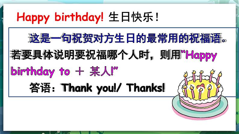 若要具体说明要祝福哪个人时,则用“Happy birthday to + 某人!”