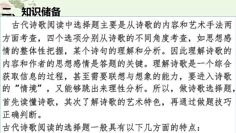 这是一份考点20 鉴赏古代诗歌之选择题(PPT)-2023年高考语文二轮复习讲练测(新高考),共27页。PPT课件主要包含了考点解读,知识储备,解题要领,真题示例,典例导引,模拟训练等内容,欢迎下载使用。