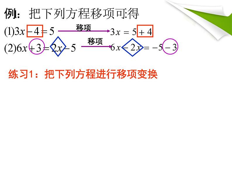 1. :一般地,把方程中的某些项改变符号后,从方程的一边移到另一边,这种变形叫做移项。