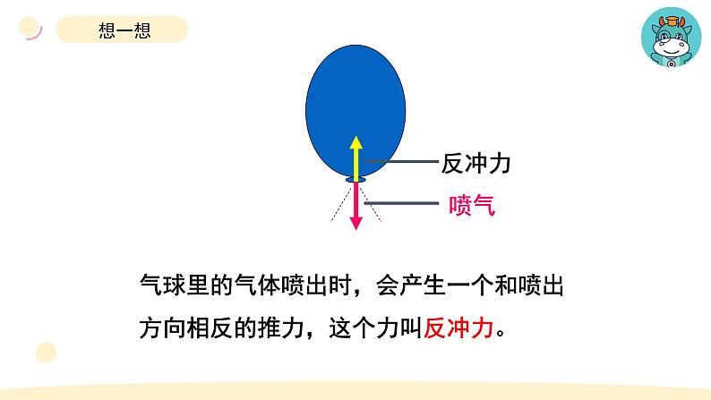 气球里的气体喷出时,会产生一个和喷出方向相反的推力,这个力叫反冲力。