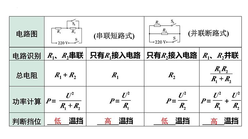 2. 如图是常见家用电器的内部简化电路图,均可实现“低温”和“高温”两个挡位的调节.请根据开关通断情况判断挡位,完成下列表格.