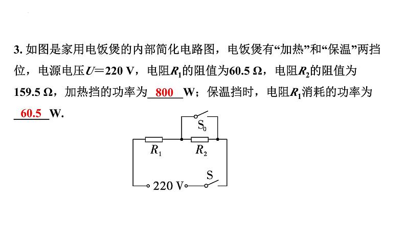 3. 如图是家用电饭煲的内部简化电路图,电饭煲有“加热”和“保温”两挡位,电源电压U=220 V,电阻R1的阻值为60.5 Ω,电阻R2的阻值为159.5 Ω,加热挡的功率为______W;保温挡时,电阻R1消耗的功率为______W.