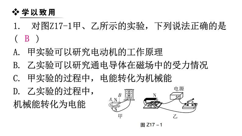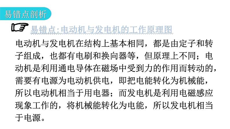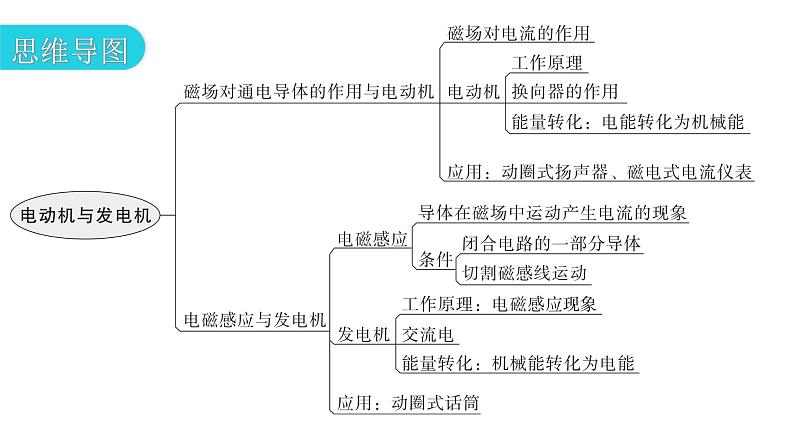 第一部分 章 节 复 习第十七章 电动机与发电机0102易错点剖析思维导图03重点突破电动机与发电机在结构上基本相同,都是由定子和转子组成,也都有电刷和换向器等,但原理上不同;电动机是利用通电导体在磁场中受到力的作用而转动的,需要有电源为电动机供电,即把电能转化为机械能,所以电动机相当于用电器;而发电机是利用电磁感应现象工作的,将机械能转化为电能,所以发电机相当于电源。易错点:电动机与发电机的工作原理图【例】下图所示的4个实验中,能说明电动机工作原理的是( ) 错因分析:对电动机与发电机的工作原理不理解,对电动机与发电机的区别不掌握。A是演示电磁感应现象,即发电机的原理,故A不符合题意;B是演示通电导体周围存在磁场的实验,故B不符合题意;C是演示磁场对通电导体有力的作用,即电动机的原理,故C符合题意;D是演示电磁铁磁性强弱与哪些因素有关的实验,故D不符合题意。答案 C1. 对图Z17-1甲、乙所示的实验,下列说法正确的是( )A. 甲实验可以研究电动机的工作原理B. 乙实验可以研究通电导体在磁场中的受力情况C. 甲实验的过程中,电能转化为机械能D. 乙实验的过程中,机械能转化为电能B重点:电动机与发电机的综合训练重点分析:电动机与发电机可以从如下方面进行区分:1. 在商场和超市的收银台常常能看到磁信息阅读器,俗称POS机。其工作原理是当带有磁条的银行卡在阅读器上刷过时,阅读器的检测头就会产生感应电流,从而得到相应的信息。下图所示的四个实验中,能说明这一物理原理的是( )A2. 关于如图Z17-2甲、乙所示的实验,下列说法正确的是( )A. 甲图是探究磁场对通电导线的作用,根据该现象制成了发电机B. 甲图中,闭合开关,只要让铜棒ab运动,灵敏电流表的指针就会发生偏转C. 甲图的实验现象说明磁能生电,乙图的实验结果说明电能生磁D. 乙图是探究导体在磁场中产生电流的条件,据此制成了电动机C3. 如图Z17-3为自发电式无线门铃发射器的示意图,它主要由可以左右滑动的绕有线圈的铁芯、永磁体、弹簧构成。按下门铃按钮会推动铁芯向右运动,松手后弹簧会将铁芯向左弹回,每按一次按钮的能量可以转化为电能并发射无线信号使接收器发出铃声。门铃发射器工作原理与下列课本实验相同的是( )B4. 电动机是利用_____________________(填“电流的磁效应”“磁场对电流的作用”或“电磁感应现象”)工作的。如图Z17-4所示,如果要改变电动机的转动方向,则需要改变________________的方向。当线圈转至平衡位置时,线圈不受力的作用,但线圈由于_______会继续转动,从而越过平衡位置。磁场对电流的作用电流或磁场惯性5. 小华在探究电磁现象的实验中,设计了如图Z17-5所示的实验装置。(1)①在图甲中将磁体向下插入螺线管中时观察到灵敏电流计的指针向右偏转,由此可知:电路中有__________产生。②将磁体从螺线管中向上拔出时,会观察到灵敏电流计的指针向______(填“左”或“右”)偏转。感应电流左③通过前两步实验,可得出感应电流的方向与__________________________________的方向有关。④学校的广播系统中,其中_____________(填“扬声器”或“动圈式话筒”)是利用这个原理工作的。导体做切割磁感线运动动圈式话筒(2)图乙装置的实验结果表明磁场对通电导体__________;为了使实验效果更明显,图中悬挂在细线下的金属棒最好选用_______(填字母)。A. 铁棒 B. 玻璃棒 C. 铝棒 D. 铜棒有力的作用C重点2:探究感应电流重点分析:考查产生感应电流的条件有闭合回路中的部分导体做切割磁感线的运动;判断是否闭合回路,是否有切割磁感线;产生的电流大小与哪些因素有关。6. 如图Z17-6所示,闭合电路的一部分导体向右运动,导体中感应电流的方向如图甲所示。改变实验条件,请在图乙中画出导体的运动方向。 如答图Z17-1所示。7. 小亮探究导体在磁场中运动时产生感应电流的条件,如图Z17-7所示,实验时控制磁场方向相同,改变导体ab的运动方向,请你帮他解决实验中遇到的问题:(1)导体水平左右运动,如图甲所示,灵敏电流计指针__________(填“偏转”或“不偏转”)。(2)导体竖直上下运动,如图乙所示,灵敏电流计指针__________(填“偏转”或“不偏转”)。(3)导体水平左右运动,如图丙所示,灵敏电流计指针__________(填“向一边偏转”或“左右偏转”),说明电路中有电流产生。不偏转不偏转左右偏转(4)如果想把该实验装置改装成探究磁场对电流作用的装置,需对器材做的改进是将灵敏电流计换作__________。电源8. 如图Z17-8甲是“探究什么情况下磁可以生电”的装置,用棉线将一段导体AB悬挂起来,放置于蹄形磁体的磁场中,再用导线把导体AB和灵敏电流计连接起来,组成了闭合电路。(1)该实验中,通过观察_________________________来判断电路中是否产生感应电流。灵敏电流计指针的偏转(2)在教师的指导下,兴趣小组对实验进行完善后,观察到的现象如表所示,由此可知,闭合电路的一部分导体在磁场中做_______________运动时,电路中会产生感应电流。这种现象叫做_______________。在此实验过程中,能量转化情况是____________________。切割磁感线电磁感应现象机械能转化为电能(3)比较第4、5(或6、7)次实验可以得出感应电流的方向与______________方向有关。(4)小明猜想磁场强弱会影响感应电流大小,于是他设计了图Z17-8乙所示的电磁铁代替原有的磁铁再次实验,此时需要在图乙的