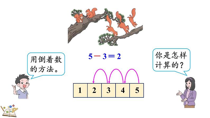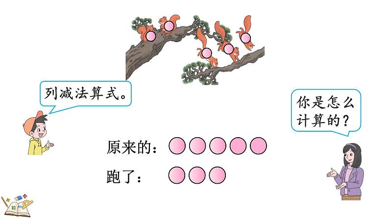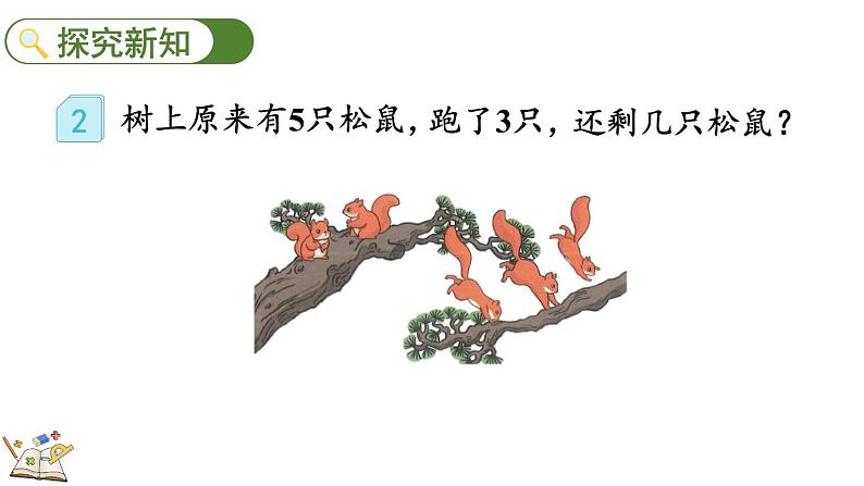 求还剩几只松鼠,就是从原有的5只里去掉3只,用减法计算。