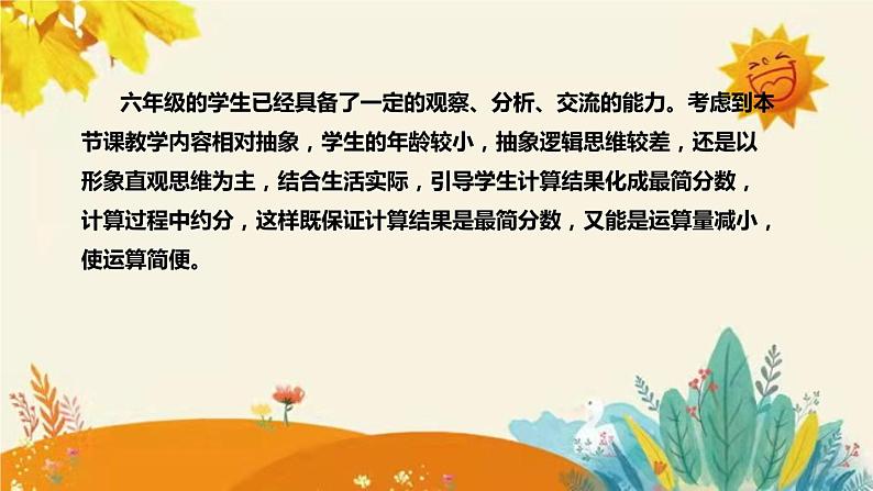 六年级的学生已经具备了一定的观察、分析、交流的能力。考虑到本节课教学内容相对抽象,学生的年龄较小,抽象逻辑思维较差,还是以形象直观思维为主,结合生活实际,引导学生计算结果化成最简分数,计算过程中约分,这样既保证计算结果是最简分数,又能是运算量减小,使运算简便。