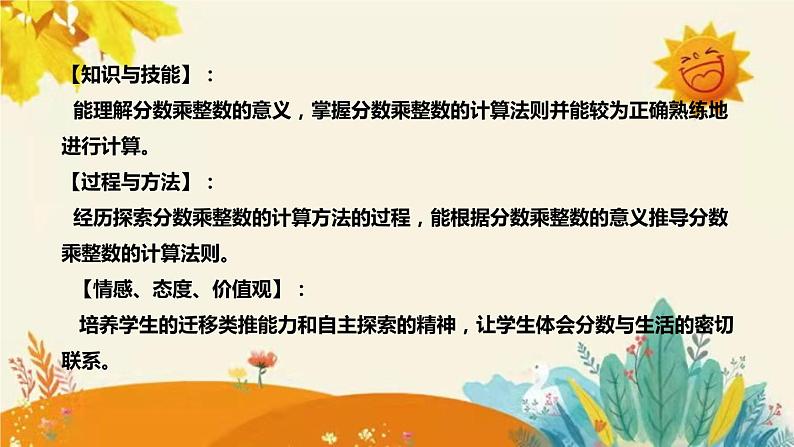 【知识与技能】: 能理解分数乘整数的意义,掌握分数乘整数的计算法则并能较为正确熟练地进行计算。 【过程与方法】: 经历探索分数乘整数的计算方法的过程,能根据分数乘整数的意义推导分数乘整数的计算法则。 【情感、态度、价值观】: 培养学生的迁移类推能力和自主探索的精神,让学生体会分数与生活的密切联系。