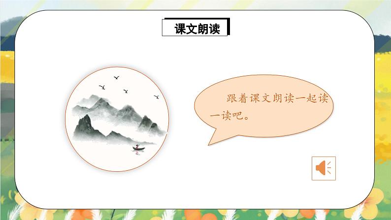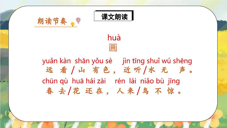 朗读指导:这首诗的朗读基调是柔和、平静的,读时速度慢些,感情要饱满,读出对画的赞美。可边读边想象画上的内容,还可根据个人感悟配上动作进行朗读表演,如读“近听水无声”时,可做侧耳聆听的动作;读“人来鸟不惊”时,做出摆手的样子。