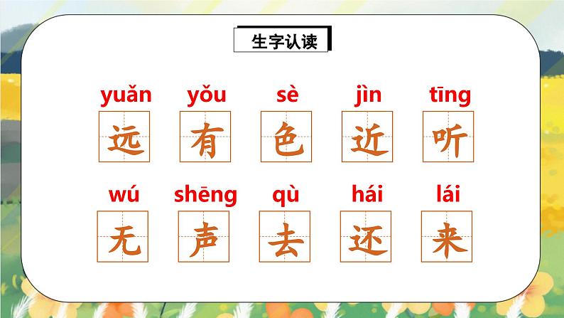 小学语文人教部编版一年级上册画图文课件ppt: 这是一份小学语文人教部编版一年级上册画图文课件ppt,共23页。PPT课件主要包含了跟我写,读一读,组词说句,去掉拼音再读一遍,远看山有色,近听水无声,春去花还在,人来鸟不惊,议一议等内容,欢迎下载使用。