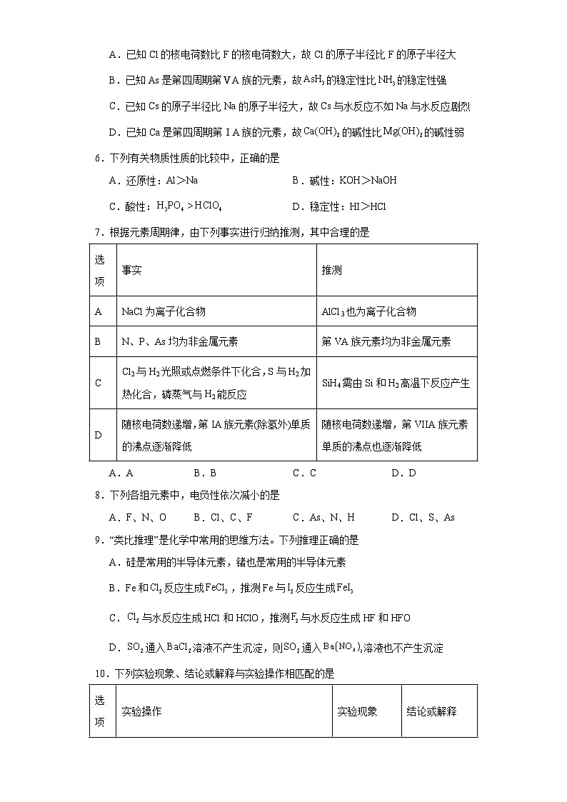 参考答案:1.B2.D3.A4.B5.A6.B7.C8.D9.A10.B11.(1) 常温 2Na+2H2O=2NaOH+H2↑ 常温 缓慢 Mg+2H2OMg(OH)2↓+H2↑ 不能 镁与盐酸 Mg+2H+=Mg2++H2↑ 2Al+6H+=2Al3++3H2↑ Na>Mg>Al(2) SiH4 PH3 H2S HCl 越来越容易 稳定性增强 Cl>S>P>Si(3) NaOH Mg(OH)2 Al(OH)3 H4SiO4(或H2SiO3) H3PO4 H2SO4 HClO4 强碱 中强碱 两性氢氧化物 弱酸 中强酸 强酸 酸性更强 两支试管中的白色沉淀都溶解 AlCl3+3NH3·H2O=Al(OH)3↓+NH4Cl Al(OH)3+3HCl=AlCl3+3H2O Al(OH)3+NaOH=NaAlO2+2H2O 两性氢氧化物(4) 增强 减小 增强 减弱 增强 减弱 12.(1) 导电 导热(2)钝化(3) 两性 Al(OH)3+3H+=Al3++3H2O(4) (5) 铝 三 ⅢA(6)d(7)Cl2+Na2S=2NaCl+S↓ 13.(1)IIIA(2)(3)铝的质子数大于镁,原子核对外层电子的吸引力更大,半径更小(4)AC 14.(1)(2)(3)(4)氯原子、溴原子、碘原子电子层数依次增加,原子核对最外层电子的吸引力依次减弱,得电子能力依次减弱,单质氧化性依次减弱 15.钾与水反应比钠与水反应剧烈,钠与水易反应,镁与水在常温下不易反应16.(1)逐渐减弱(2)D(3)2Na+2H2O=2Na++2OH-+H2↑(4)BC(5)2Al+6H+=2Al3++3H2↑ 17.(1)(2) 434 氧或O 18. 六 IIIA A-162 A B19.锶位于元素周期表中第5周期ⅡA族,很活泼,遇水立即燃烧爆炸,保存时要密闭干燥20.(1)第三周第VIA族(2) He F HClO4(3) 强 r(Na)>r(O)>r(F) 21.(1) 橙红 紫红(2)同主族元素从上到下,元素原子的得电子能力逐渐减弱(3) 2Br-+Cl2=2Cl-+Br2 2I-+Br2=2Br-+I2 22.(1)圆底烧瓶(2)A(3) X C12 + 2Br- =2Cl- + Br2 棉球变蓝 Cl2+2OH-=Cl-+ClO-+H2O(4)观察氯气是否被吸收完全(5)不能,由于不能保证氯气和溴化钠完全反应,则生成的溴单质中含有过量的氯气,则不能证明Br和I得电子能力相对强弱 23.(1) 分液漏斗 HClO4(2)出现白色沉淀(3)NaHCO3(4)淀粉(5) 酸化的BaCl2溶液, 3SO2+2H2O 4H++ 2SO+S↓