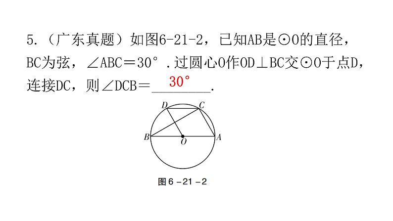 5.(广东真题)如图6-21-2,已知AB是⊙O的直径,BC为弦,∠ABC=30°.过圆心O作OD⊥BC交⊙O于点D,连接DC,则∠DCB=________.