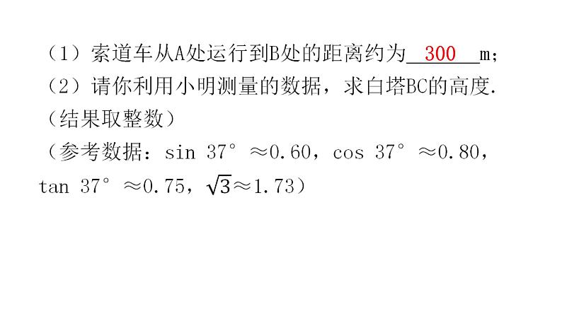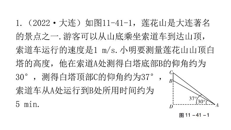 1.(2022·大连)如图11-41-1,莲花山是大连著名的景点之一.游客可以从山底乘坐索道车到达山顶,索道车运行的速度是1 m/s.小明要测量莲花山山顶白塔的高度,他在索道A处测得白塔底部B的仰角约为30°,测得白塔顶部C的仰角约为37°,索道车从A处运行到B处所用时间约为5 min.